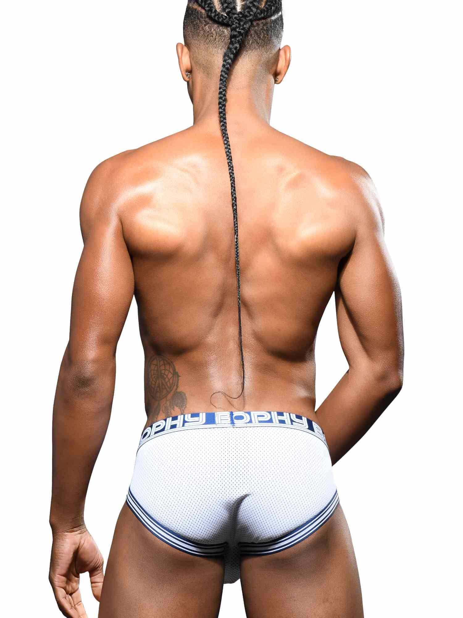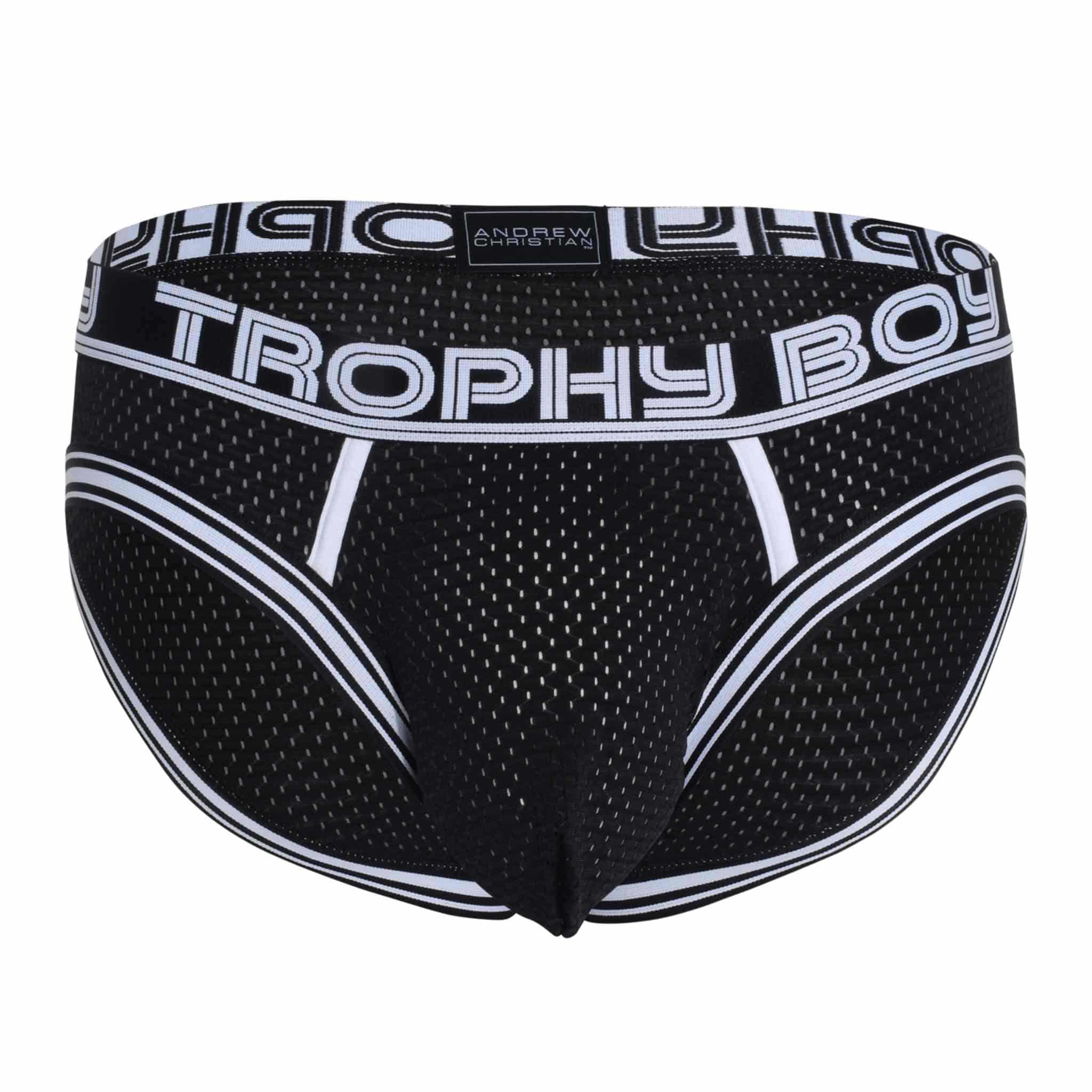 Brief sportif de la collection 'Trophy Boy' d'Andrew Christian. Les sous-vêtements de cette gamme sont bien connus pour leur poche plus large qui vous donne l'impression de ne rien porter et un confort optimal. Il est fabriqué en polyester avec un peu d'élasthanne donc il est hyper doux au toucher, extinsible et un peu brilliant. Le slip est disponible en noir et blanc avec de magnifiques détails en mesh.