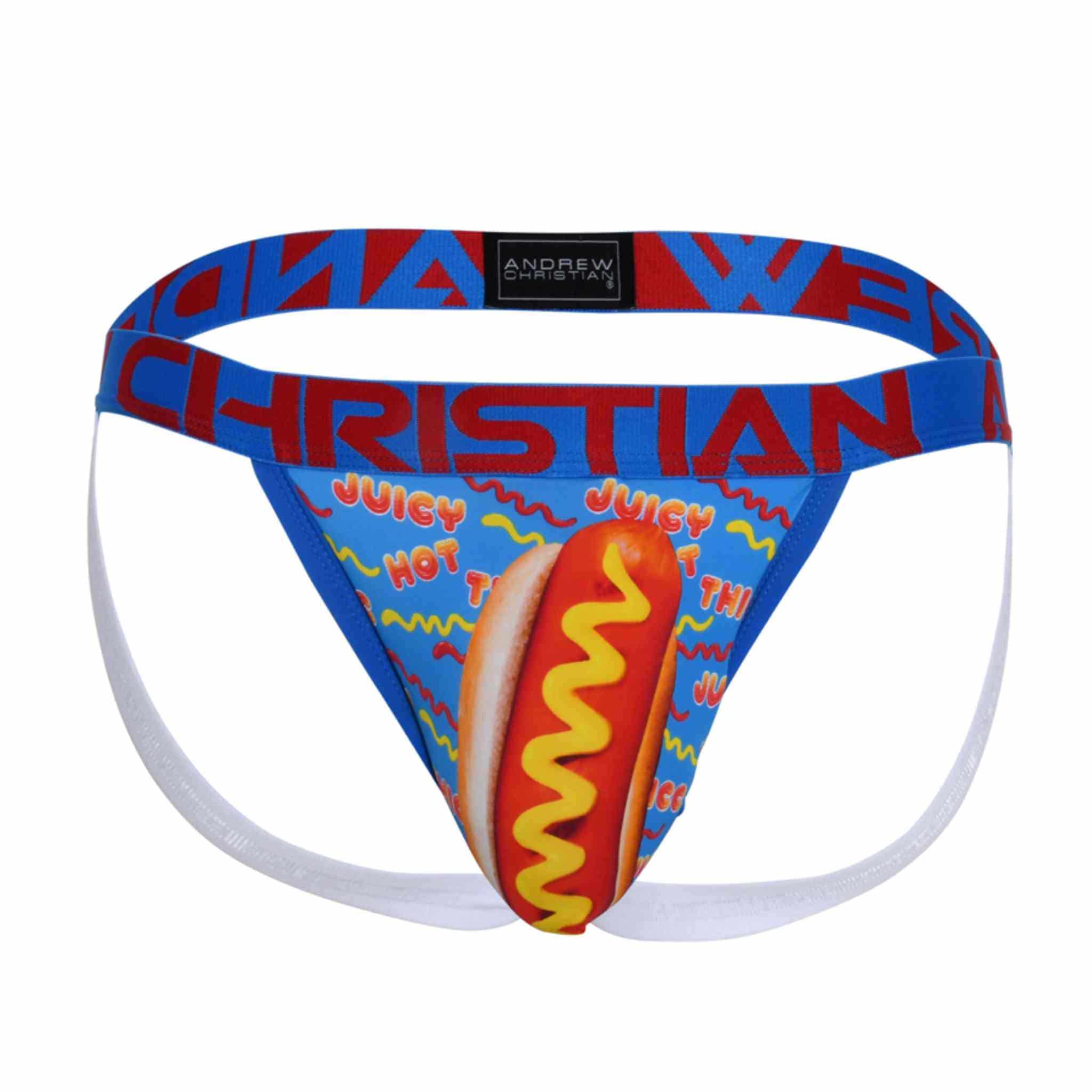 Le Hot Dog est un jockstrap d'Andrew Christian qui se distingue, comme son nom l'indique, par son imprimé d'un hot dog. Les sous-vêtements de la gamme 'Almost Naked' sont bien connus pour leur poche anatomique, qui vous donne l'impression de ne presque rien porter lorsque vous le portez. Le jock est fabriqué en polyamide avec un peu d'élasthanne donc il est hyper doux au toucher, extinsible et il reste durablement éclatant. Disponible en bleu.