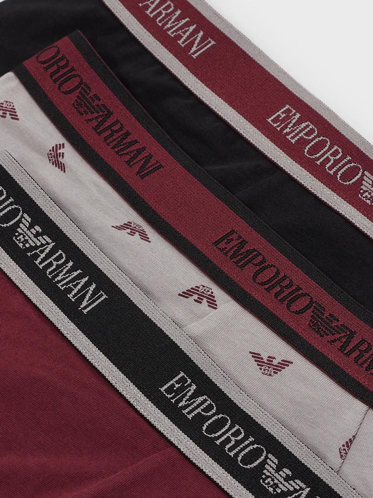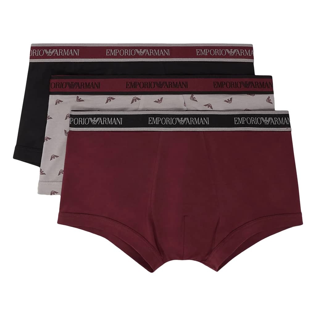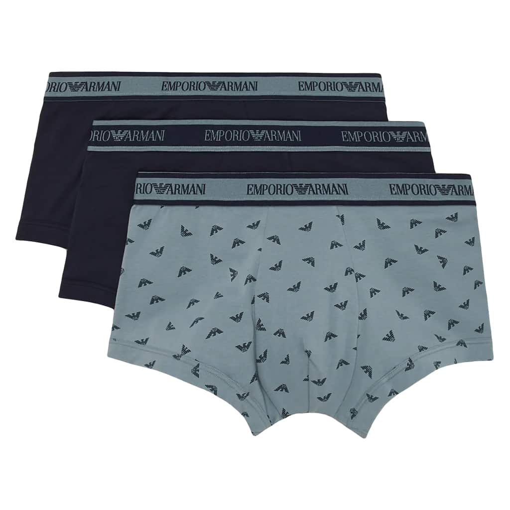 Lot avantageux de trois trunks d'Emporio Armani. Les trunks sont fabriqués en coton stretch donc ils sont hyper doux, respirants et confortables à porter. Une poche découpée et une coupe parfaite avec un soutien supplémentaire pour les fesses assurent le meilleur confort de port. Le lot est disponible en différentes combinaisons de couleurs unies, dont un avec un imprimé de petits aigles de Giorgio Armani.