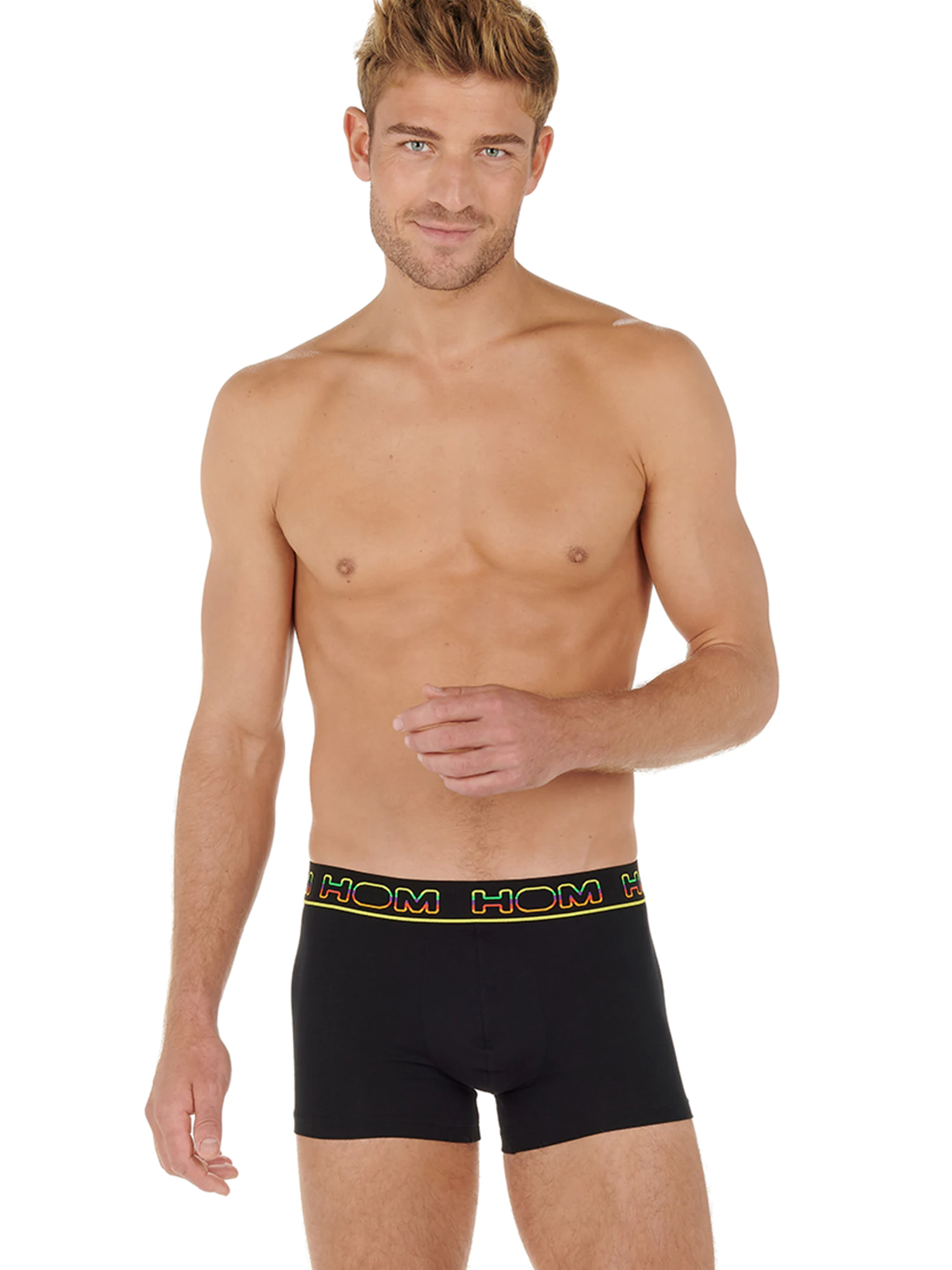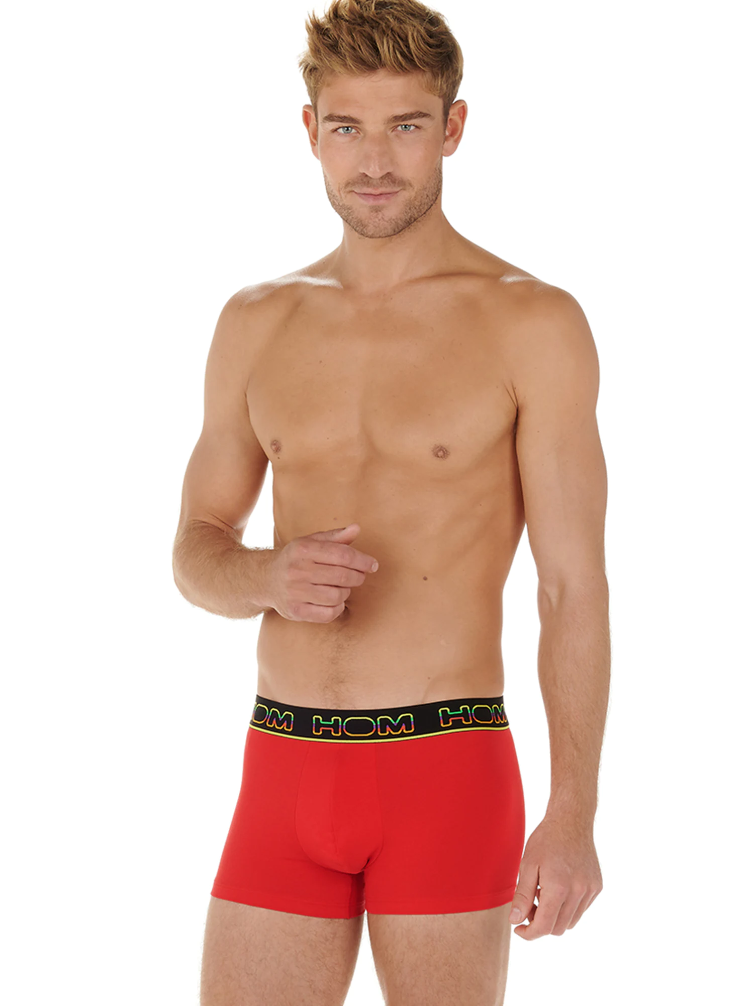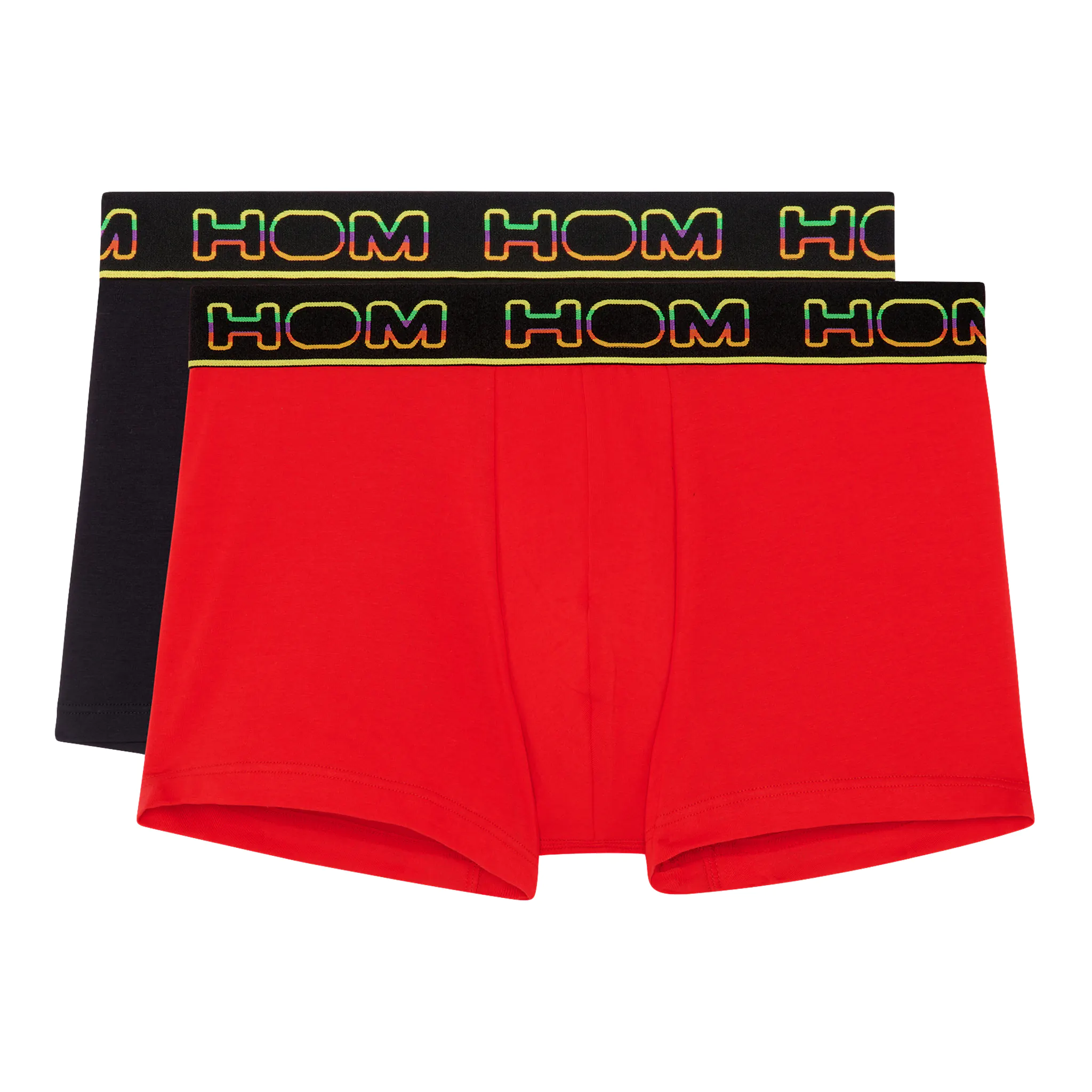 Lot avantaguex de deux boxers qui font partie de la collection Boxerlines d'HOM. Les boxers de cette collection sont fabriqués en coton tissé avec un peu d'élasthanne. Voilà pourquoi ils sont hyper doux et ils sont toujours confortables à porter. Le lot 'Ivano' se compose de deux boxers en noir et rouge avec des coutures d'une couleur éclatante.