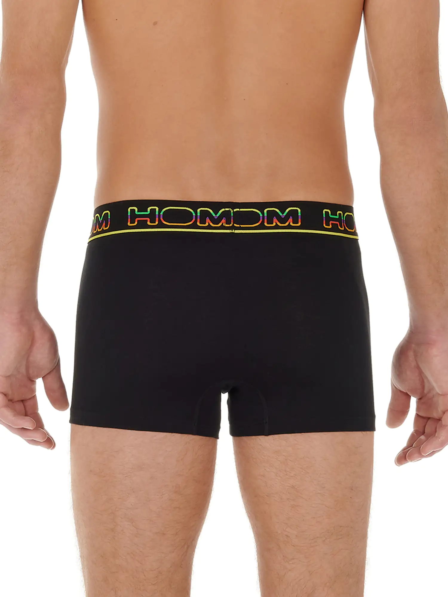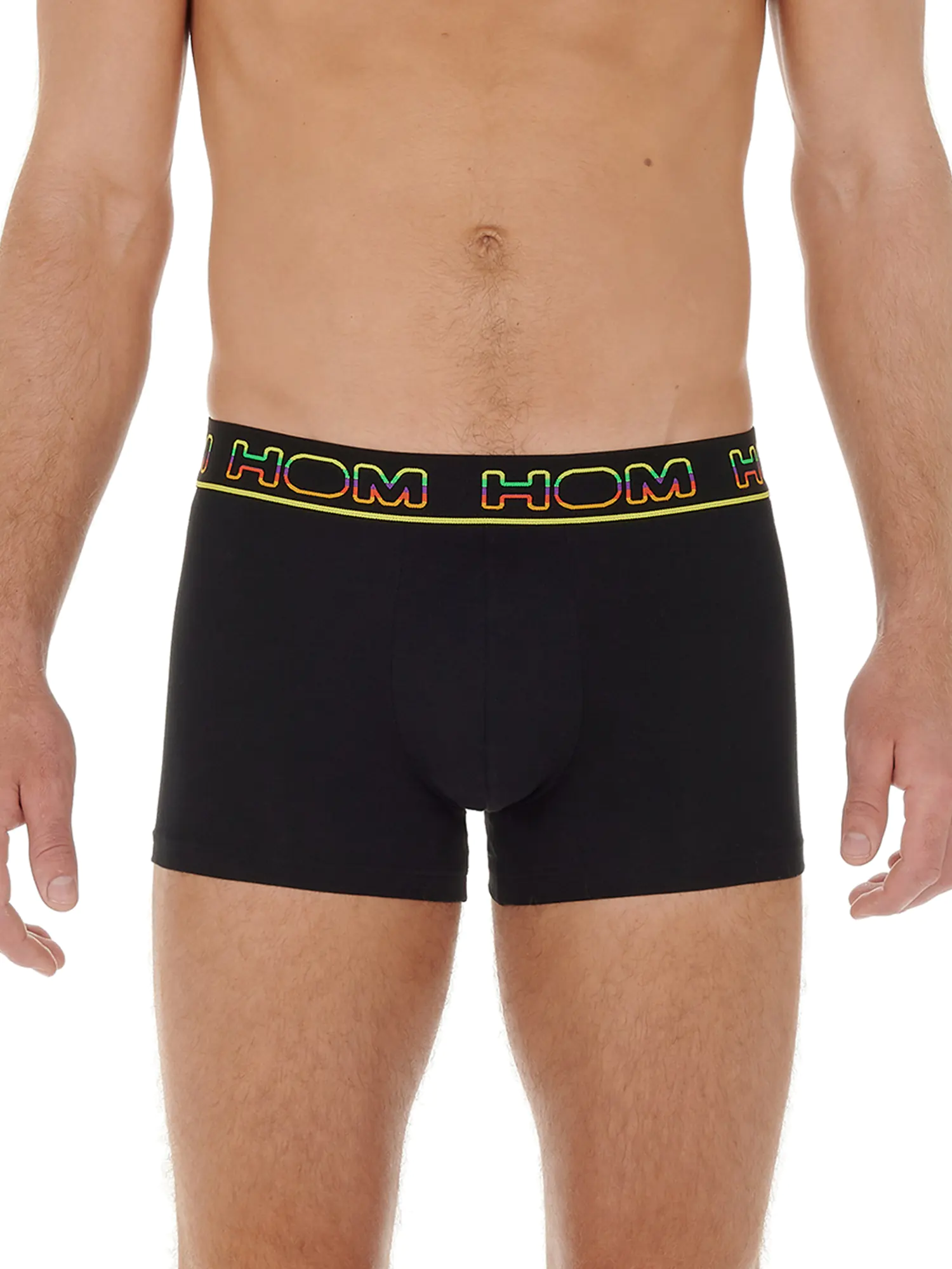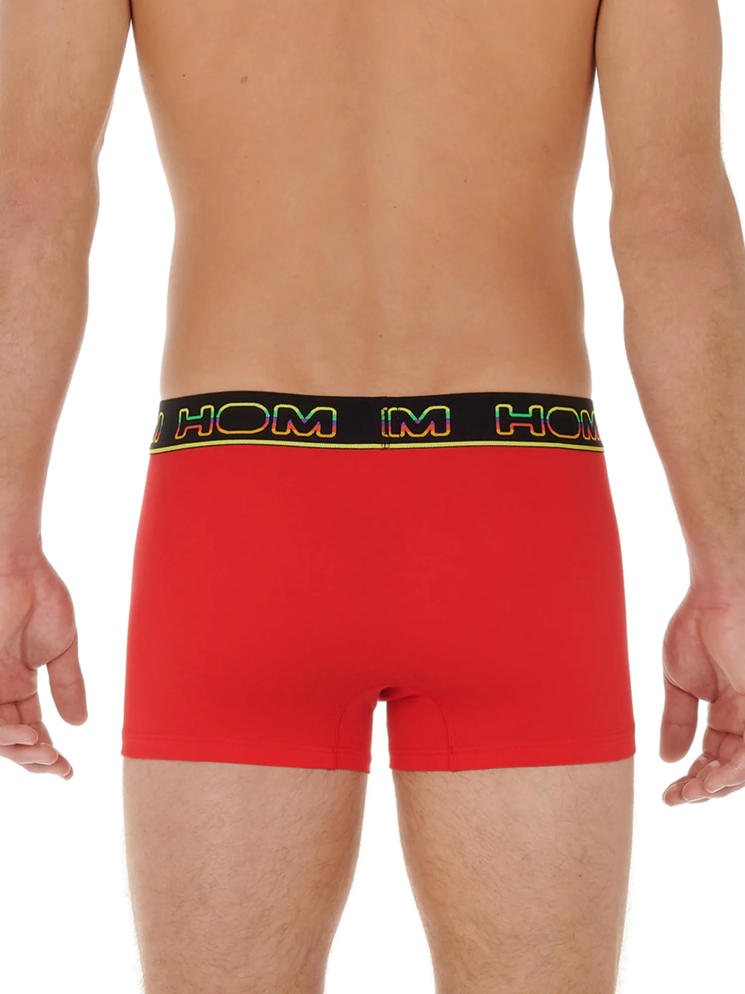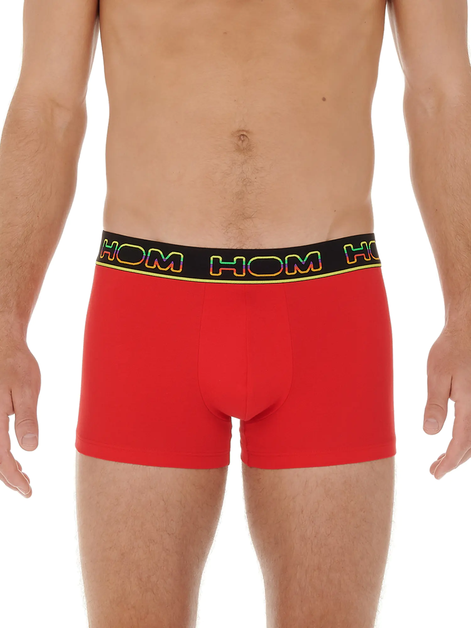 Lot avantaguex de deux boxers qui font partie de la collection Boxerlines d'HOM. Les boxers de cette collection sont fabriqués en coton tissé avec un peu d'élasthanne. Voilà pourquoi ils sont hyper doux et ils sont toujours confortables à porter. Le lot 'Ivano' se compose de deux boxers en noir et rouge avec des coutures d'une couleur éclatante.