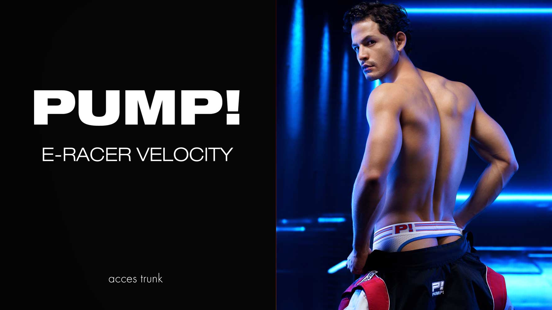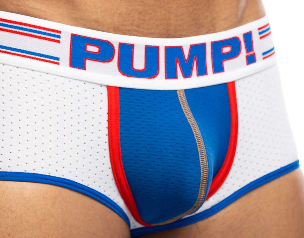 Le Velocity - Access Trunk avec un corps en maille blanche brillante et une coque en maille bleue pour un look sportif. Le Access trunk est fini avec des passepoils rouges, vous donnant une sensation palpitante comme si vous étiez en train de courir. La large ceinture avec des rayures de course vous propulse en surmultipliée. Comme si cela ne suffisait pas à attirer l'attention des gens! Le dos est ouvert, et les fesses sont soutenues par un élastique, un trunk avec le plaisir d'un jockstrap.