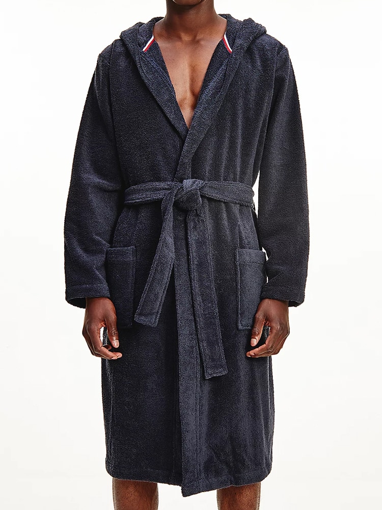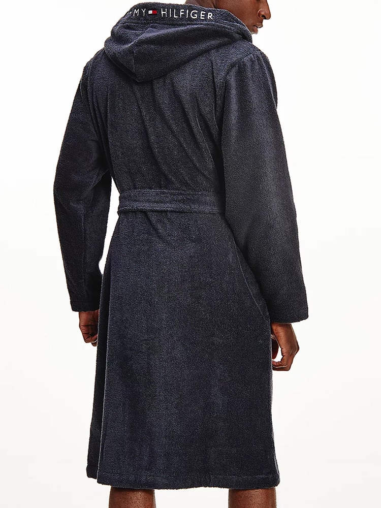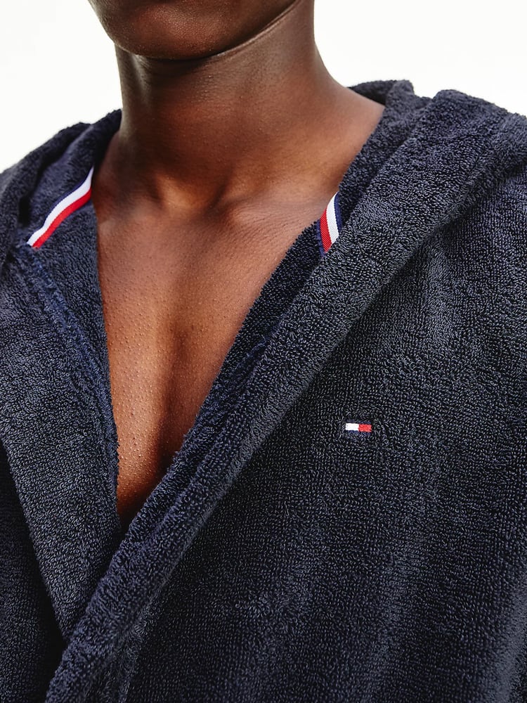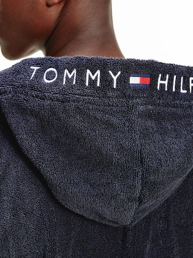 Peignoir de luxe de Tommy Hilfiger qui est réalisé en 100% de coton bio. Il a été cultivé sans pesticides ni fertilisants chimiques, et sans graines génétiquement modifiées. Le peignoir est donc parfait pour votre soirée détente tout en respectant l'environnement. La capuche, avec le nom de la marque sur le bord, et les deux poches plaquées à l'avant lui prêtent un esprit fonctionnel. Disponible en gris foncé avec le fameux drapeau de TH brodé sur la poitrine.