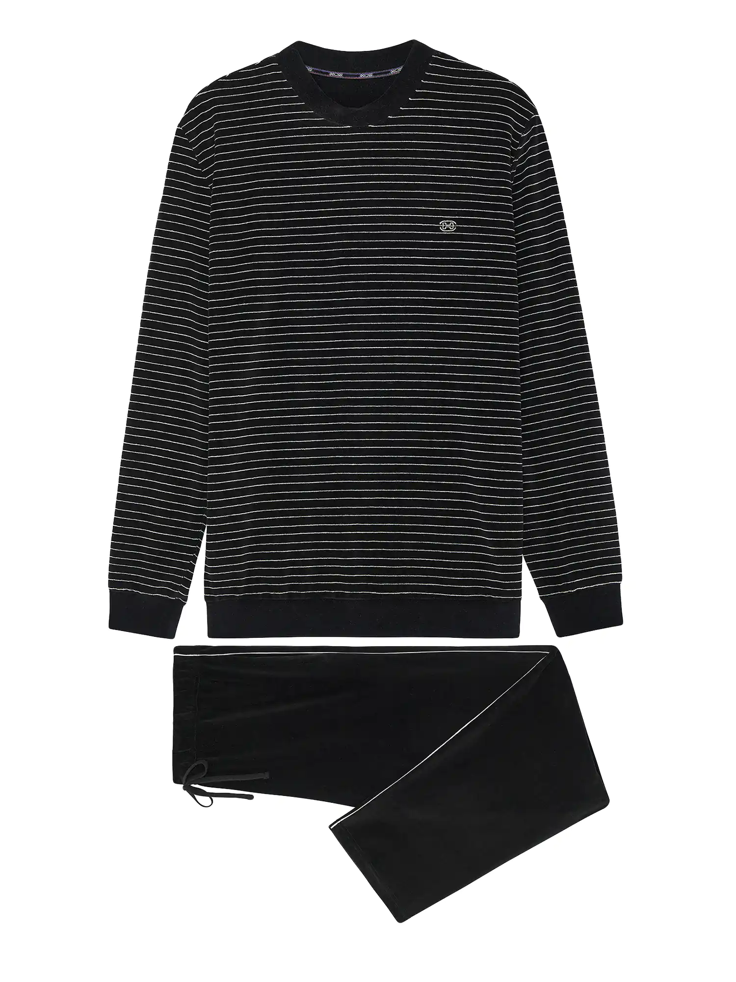De Norman is een huispak gemaakt van zacht velours katoen gemixt met polyester, waardoor het huispak een zachte touch heeft. Het pak bestaat uit een sweater met lange mouwen met een ronde hals en een effen broek. De afwerking van de sweater is functioneel met banden aan het einde van de mouwen en rondom de taille, zodat de warmte behouden blijft. De broek van deze indoor-set loopt losjes langs het been en heeft een elastische heupband voor een comfortabele fit. Langs het been loopt een verticale lijn voor een sportieve look. Aan de linker en rechterzijde van de broek vind je steekzakken en is de broek net als de top gemaakt van velours. Omdat het pak is gemaakt van een mix met katoen blijft de temperatuur comfortabel gereguleerd en is het pak makkelijk te reinigen.