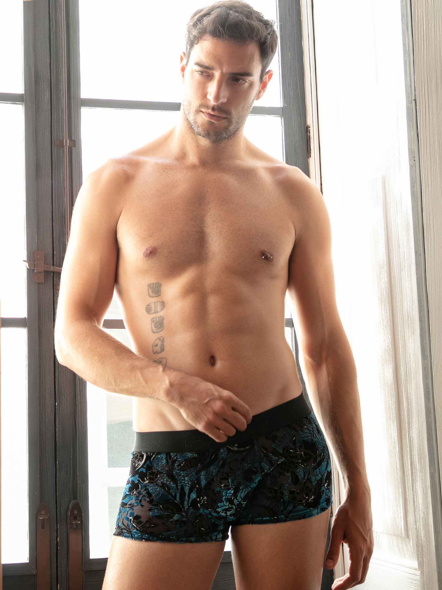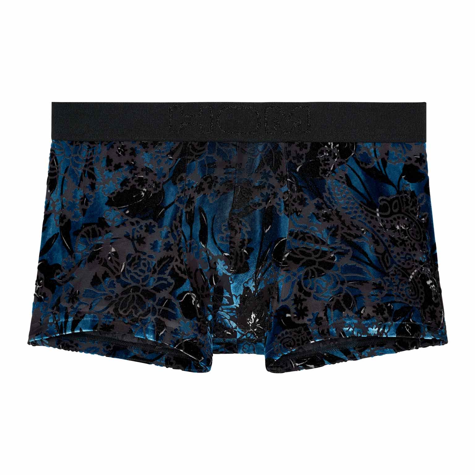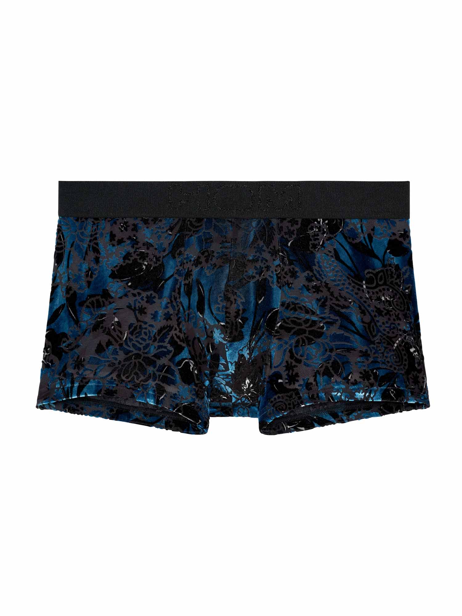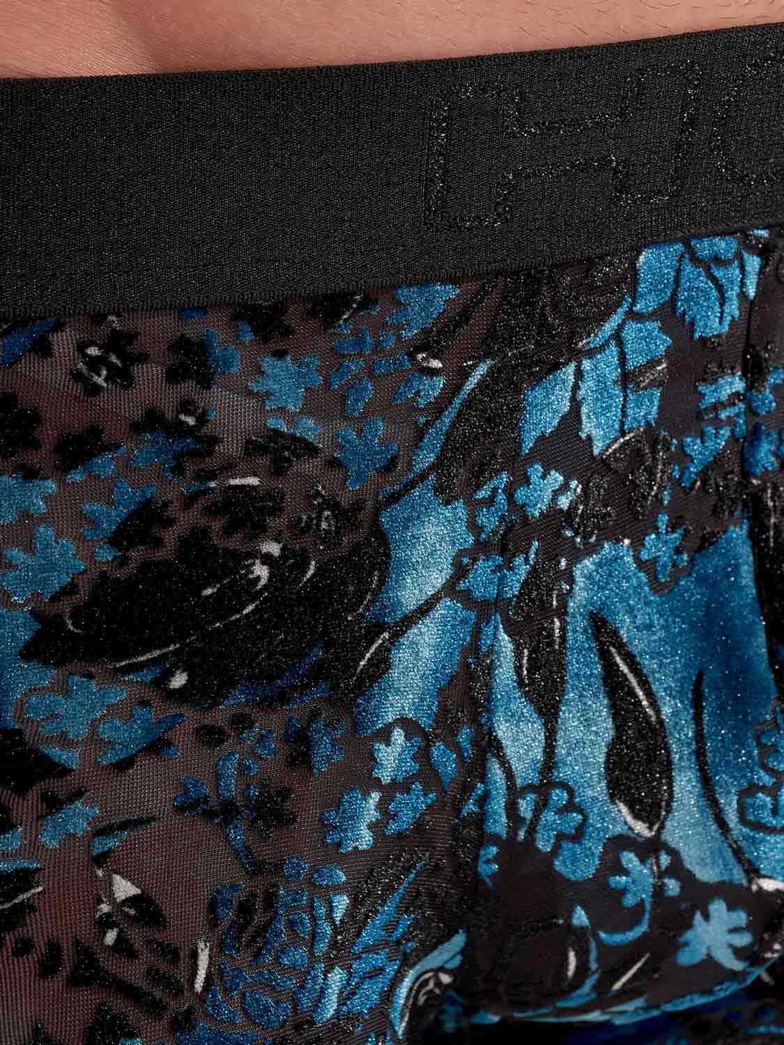 De HOM Fremont trunk is pure Temptation, uitgevoerd in dévoré fluweel dat zijdezacht aanvoelt op de huid en het licht vangt met een elegant, barok geïnspireerd dessin. De diepe zwarte basis wordt versterkt door elektrische blauwe accenten en een zachte shimmer, als Las Vegas neon, gedurfd maar perfect verfijnd. Met een transparant detail bij de pijp en een comfortabele voering aan de voorkant biedt deze trunk een zelfverzekerd silhouet met luxe draagcomfort. De zachte tailleband is afgewerkt met een gecentreerd HOM logo in lurex, de perfecte finishing touch.