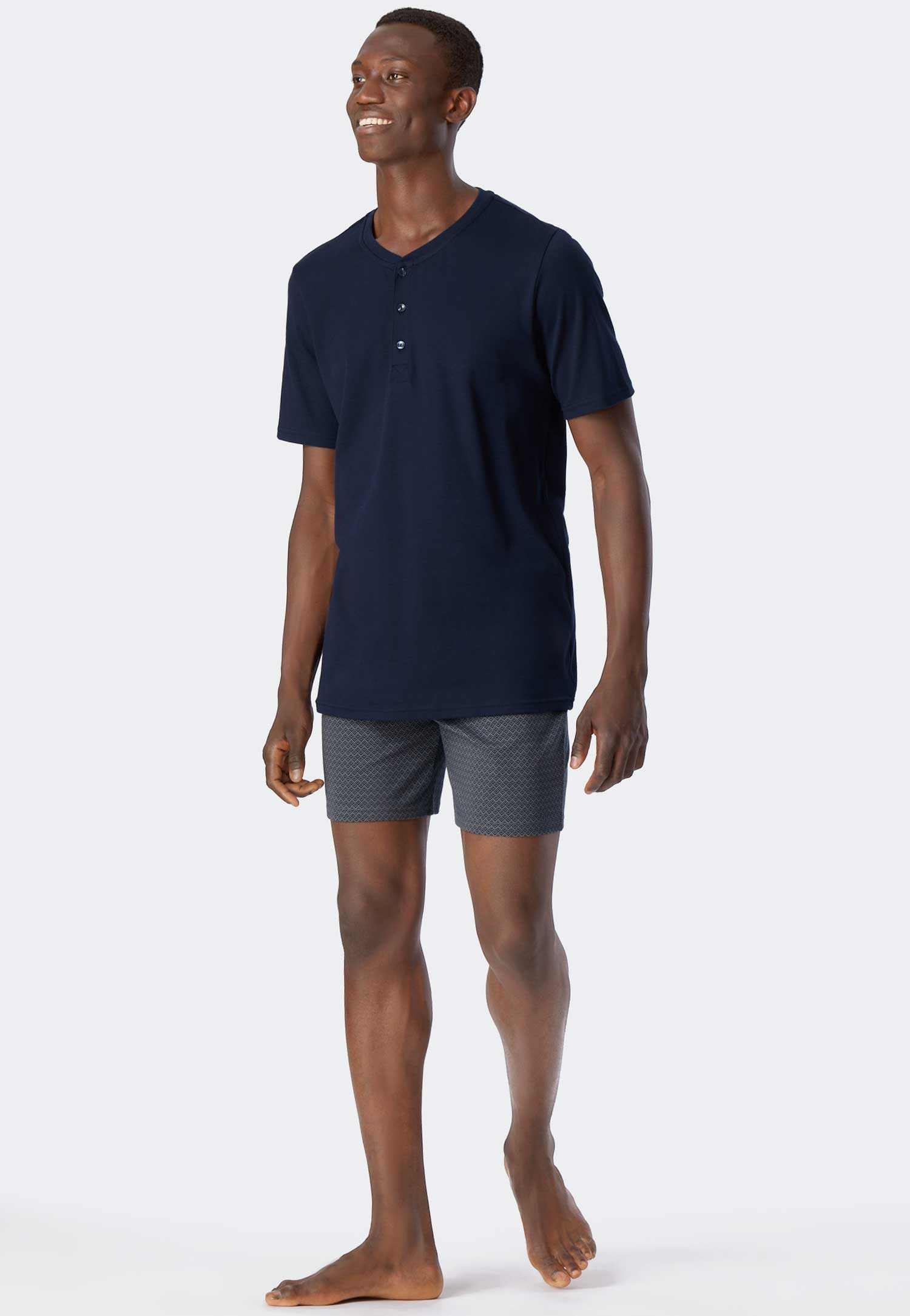 Korte heren pyjama van Schiesser gemaakt van 100% katoen, met een effen shirt en een short met een opvallend patroon. De pyjama heeft een shirt met ronde hals en een short met een trekkoord in de heuplijn voor een verstevigde fit. Geproduceerd met een interlock kwaliteit met een casual look en feel.